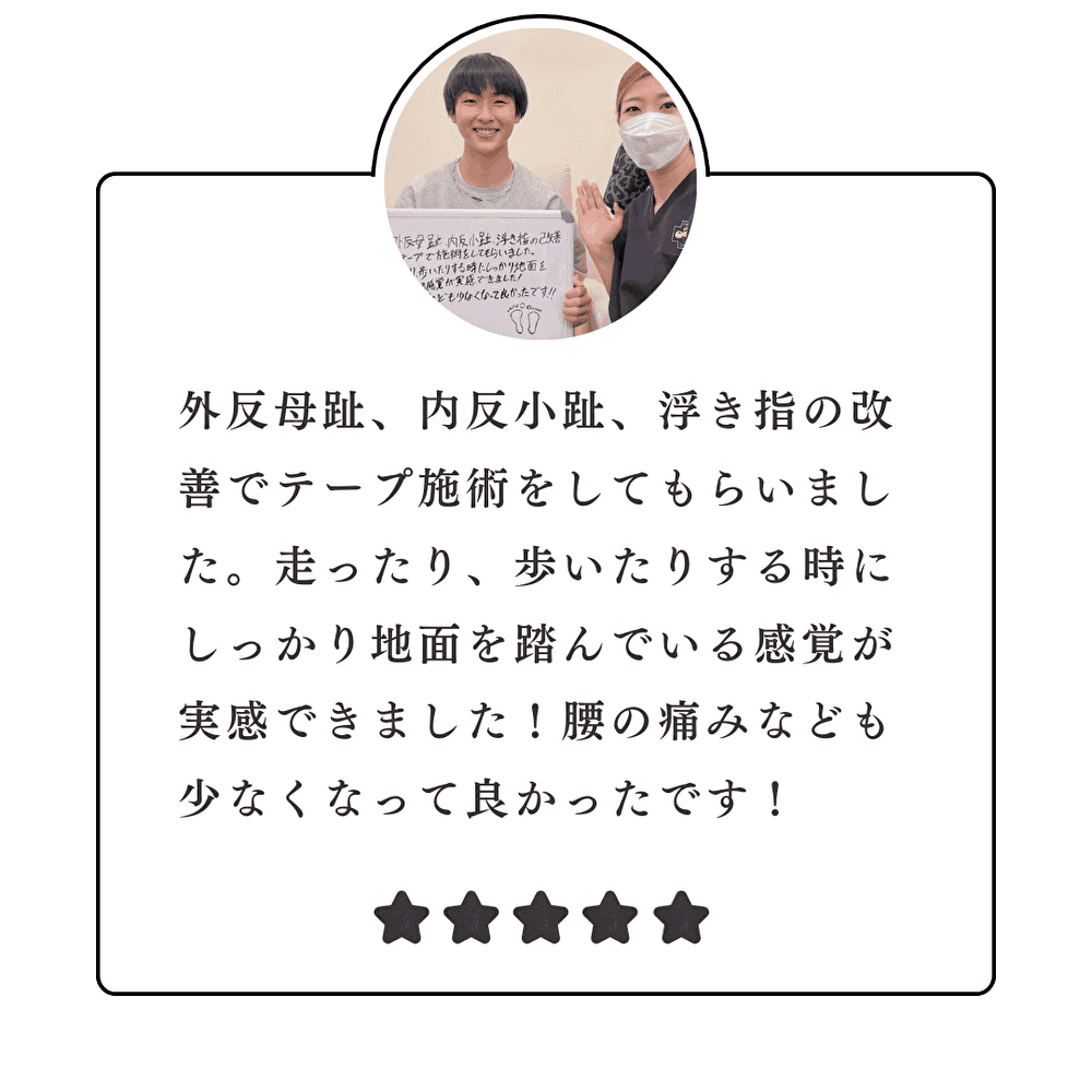外反母趾などのお悩みがある足は、「衝撃を受けやすい」「ねじれやすい」状態になっていることが多いです。整足テーピングでアーチと足指のバランスを整えることで、足が本来持っている“クッションのような働き”を取り戻し、ねじれもやさしくサポート。正しい足の使い方に近づくことで、負担の少ない足へと導き、再発しにくい状態を目指します。