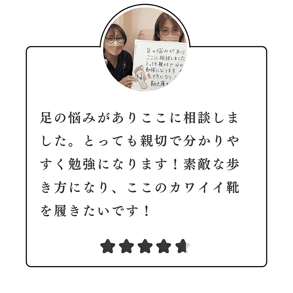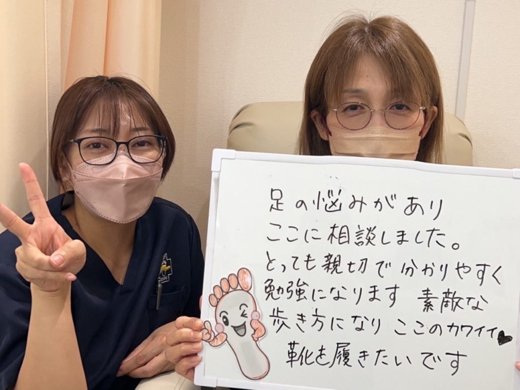 年齢とともに徐々に外反母趾が悪化し、見るからに出っぱってきていましたし、太いヒールでも痛みで辛くなってきたので、まずは足を専門としている整形外科クリニックを受けました。レントゲンを撮って骨の状態をみて、インソールの提案を受けましたが、もし手術してもインソールはずっと使い続けると聞き、期待していた方向性と違っていたので困っていた矢先に整足院さんと出会いました。