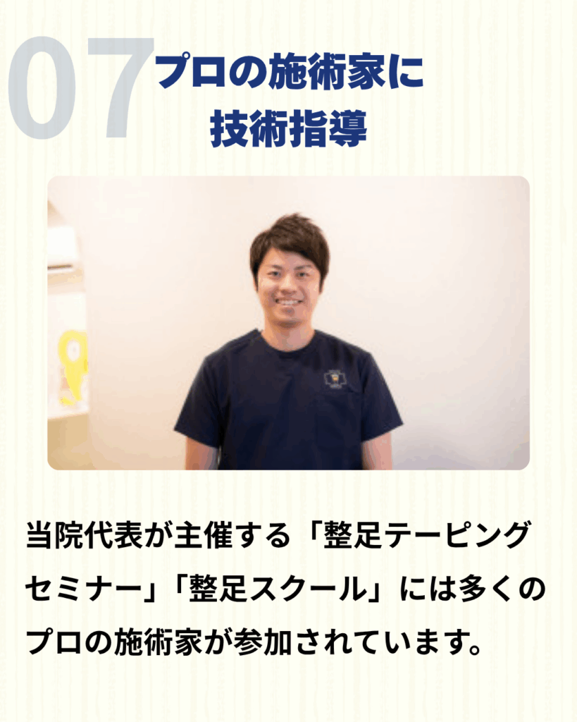 まずは、つらい痛みを少しでも早く楽にしていただくことを大切にしています。「どんな時に痛むか」「いつから痛みがあるか」など、お話をうかがいながら、原因を一緒に探っていきます。専用の足型測定器(フットプリンター)を使って、外反母趾の角度やアーチの状態、重心のバランスを詳しくチェックし、お一人おひとりに合わせた“整足テーピング”を施術いたします。
