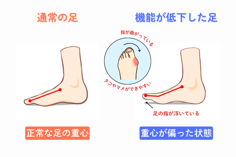 外反母趾などの足の痛みの原因は、足の機能が低下し、次第に変形していくことにあります。肌や髪の毛と同じように、足も加齢や運動不足、そして日常生活のちょっとしたクセによって少しずつ衰えてしまうのです。